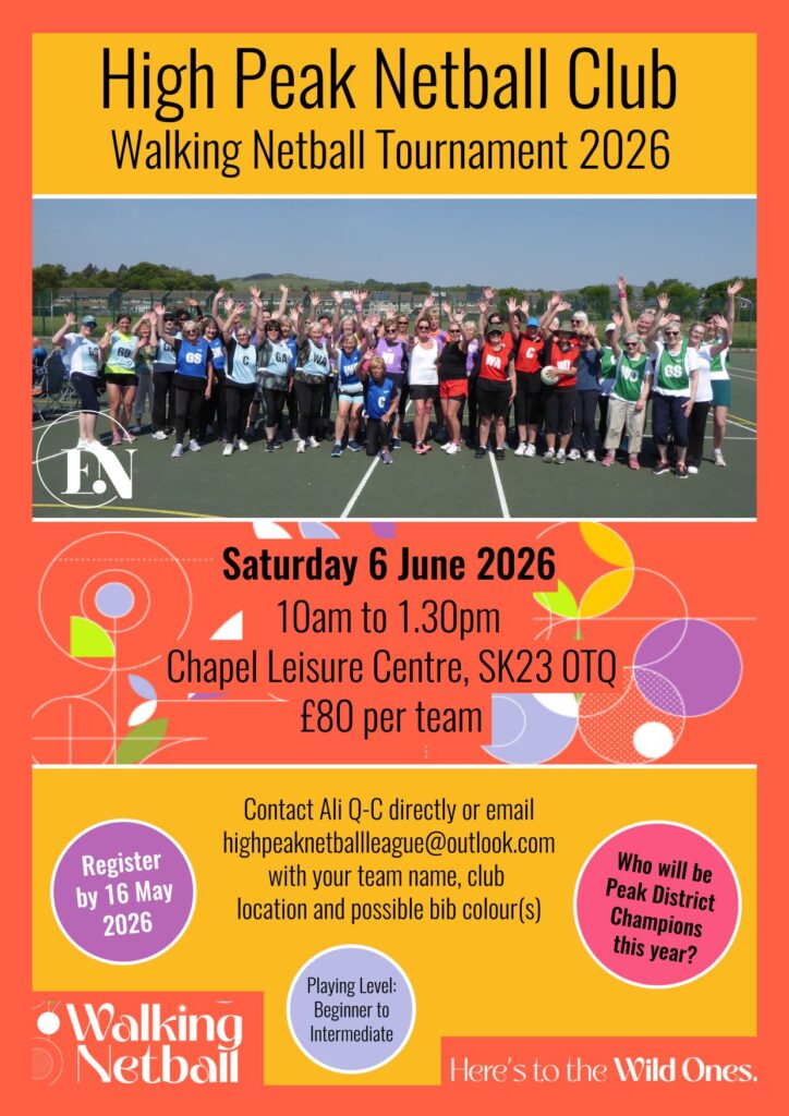 Our Walking Netball Tournament in 2025 will take place on Saturday 7 June, 10.30am-1.30pm, once again on the outdoor courts at Chapel Leisure Centre in Chapel-en-le-Frith.